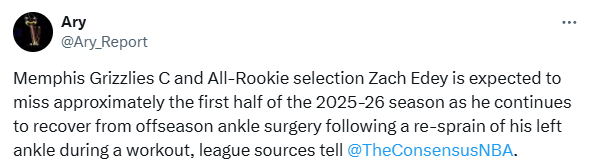 今年休赛期,伊迪在6月份的一次训练中扭伤左脚踝,之后接受手术治疗,当时灰熊官方宣布伊迪至少休战4个月;可如今,Ary报道称,埃迪在一次训练中再次扭伤今夏做过手术的左脚踝,预计将缺席2025-26赛季前半程的比赛。