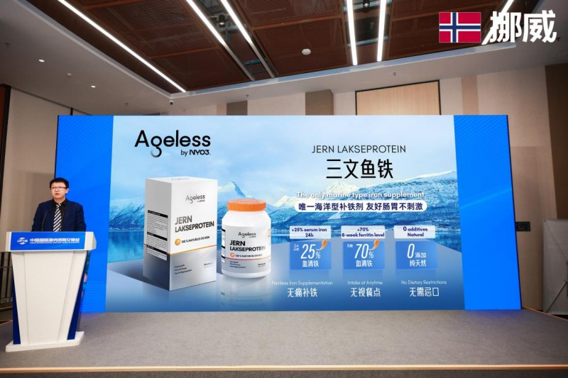 作为 NYO3“磷虾油之后第二增长曲线” 的核心产品,Ageless 三文鱼铁延续了品牌 “自然纯粹” 的挪威基因,为亚太区缺铁问题提供了全新解决方案。该产品采用从挪威三文鱼中提取的天然血红素铁,无任何人工添加,对肠胃无刺激。同时,借助稳定的卟啉包裹技术,其吸收率较传统非血红素铁提高2-3倍,且不易受膳食成分抑制,实现了温和补气血的效果。最新人体实验数据显示,服用 24 小时后血清铁含量提升 25%,八周后可提高 70%。