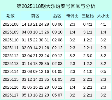 当期前区号码大小比为3:2,三区比为2:2:1,奇偶比为3:2。